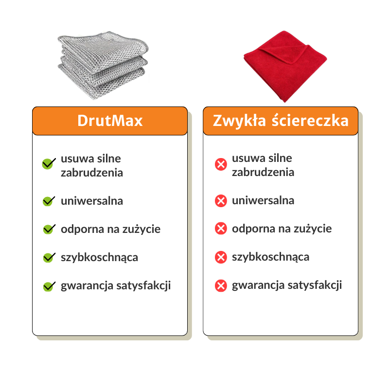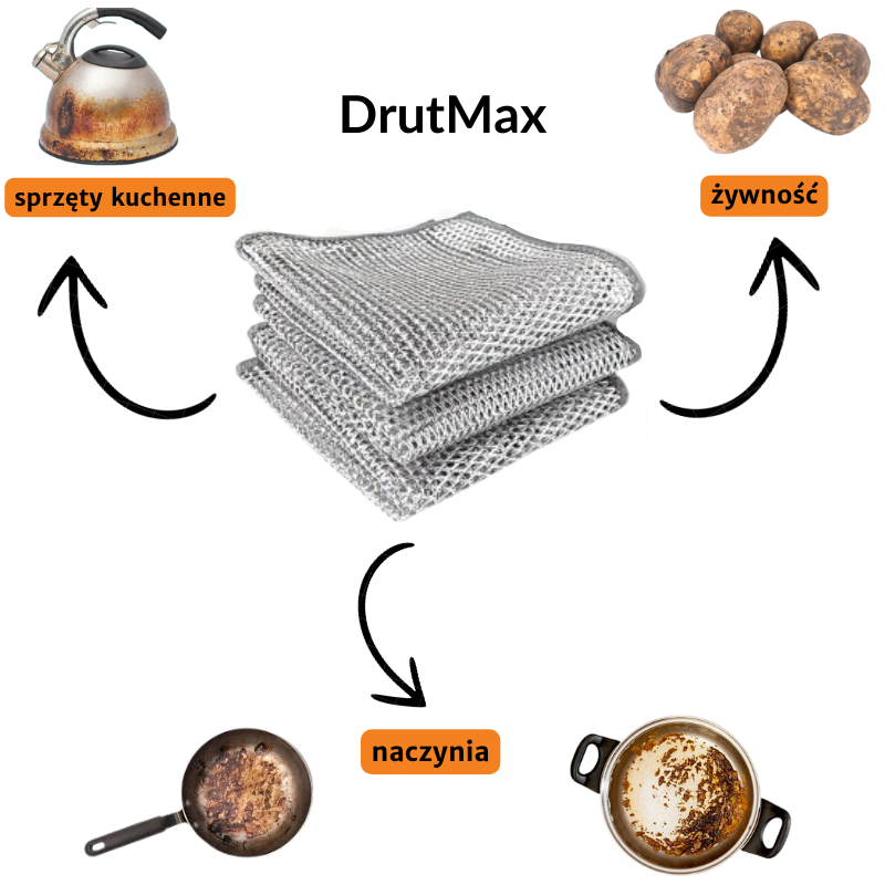 Ściereczki DrutMax są wykonane z trwałego i elastycznego nylonu oraz bawełnianych włókien ze stali nierdzewnej.