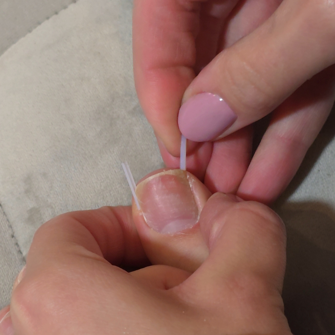 ➡️ Krok 2: Umieść wkładkę prostującą pod paznokciem i przytnij wedle potrzeby.