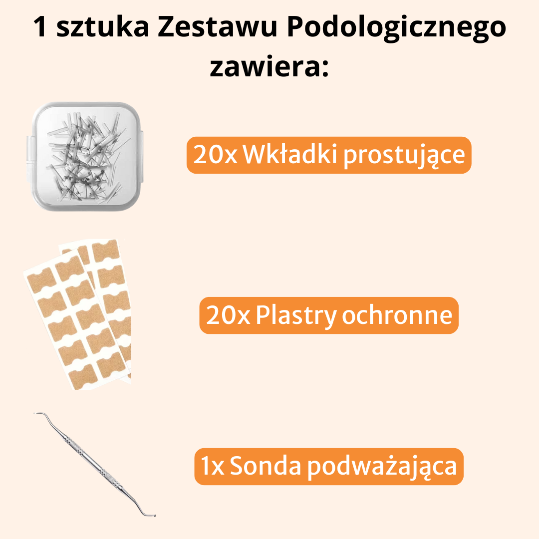 Zestaw Podologiczny zapewnia realną ulgę przy każdym kroku, korygując kierunek wzrostu paznokcia już od pierwszego użycia.